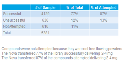 The initial study incumpased 5381 compounds that had been pulled from mass storage to fulfill orders sent from labs. The first step of that study was to quickly visually inspect compounds to determine their consistancy and whether they were free flowing powders or liquids, tares or chuncks. Of the 5381 selected, 616 were determined to be either a liquid, a tare or large chuncks which were not compatible with the Nova system. The 616 compounds were removed from the study.