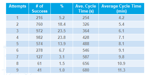 The following chart gives a breakdown of the number of successful transfers and the number of attempts required to complete them. Keep in mind that not all collection attempts result in a transfer of compound into the destination container. A completed transfer may have required 5 collection attempts but perhaps only two meet the weight criteria that would have resulted in a transfer. Collection attempts may result in too much or too little but still count as an attempt. Only those collection attempts meeting the weight criteria will result in a transfer. Note 1: Also, these numbers are not inclusive of the total study as the results for more than 9 attempts were extremely minor in comparison to those shown. Note 2:If you are not familiar with the concept of an attempt, please watch videos.